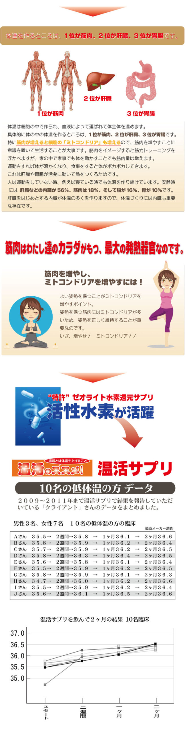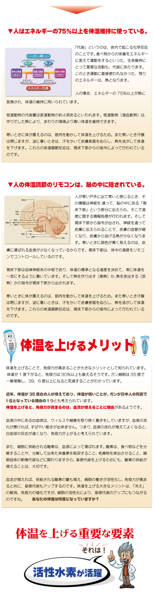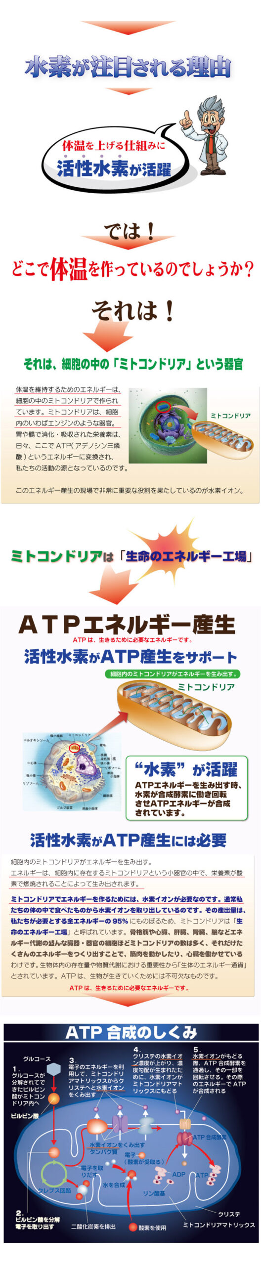| ゼオライトにこだわる理由は、 <1>●ゼオライト技術で「水素」を発生させることができる。 <2>●生命エネルギーATP(アデノシン三燐酸)の製造に水素が利用されるのです。 <3>●ATPエネルギーが体温を上げる |
